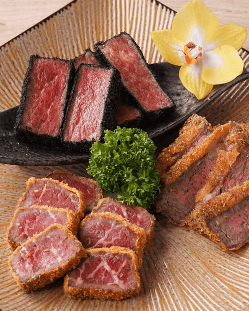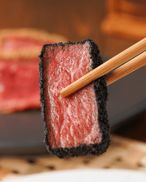 使用以精美的大理石紋路著稱的日本A5和牛,包裹在高級黑色竹炭麵衣中,風味絕佳。